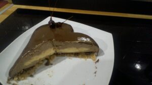 Entreposer au congélateur plusieurs heures (voire une nuit), afin que l’entremet soit bien pris et puisse être démoulé. L’entremet doit être quasi congelé, afin que le glaçage puisse prendre.