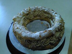 Découper la couronne de pâte à chou dans . Pocher un peu de crème au praliné sur chacun des 8 choux, poser dessus une 1/2 sphère de praliné congeler ou pocher une noix de praliné (si version 2), puis terminer par une couche de crème au praliné.