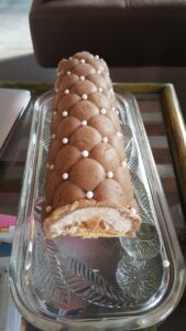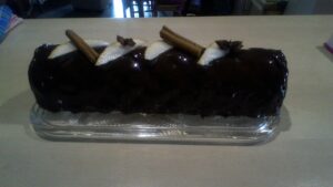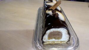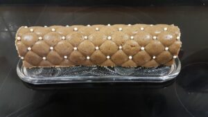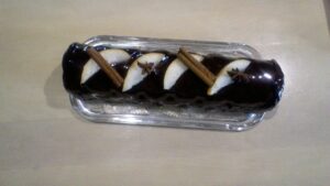 Si nécessaire chauffer la gouttière inox à l’aide d’un chalumeau quelques secondes pour la démouler facilement. Puis replacer votre bûche de noël chocolat poire au congélateur quelques minutes.
